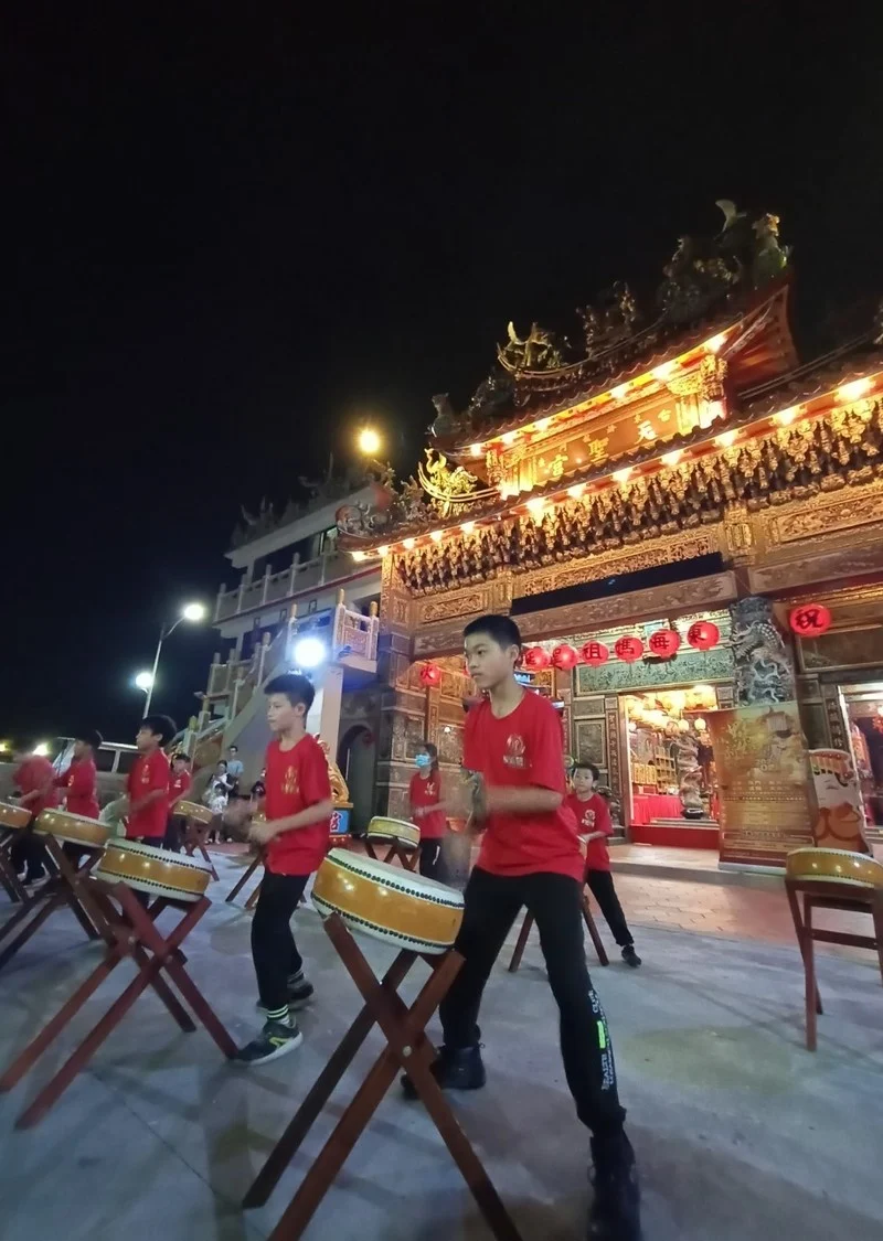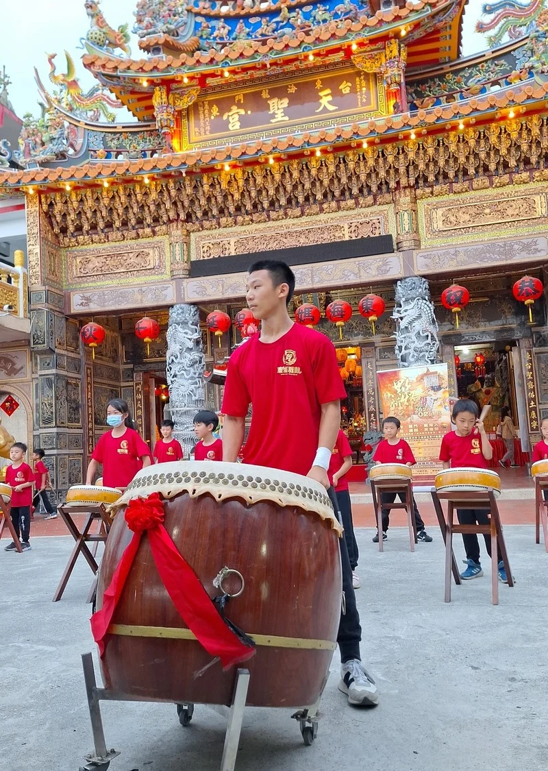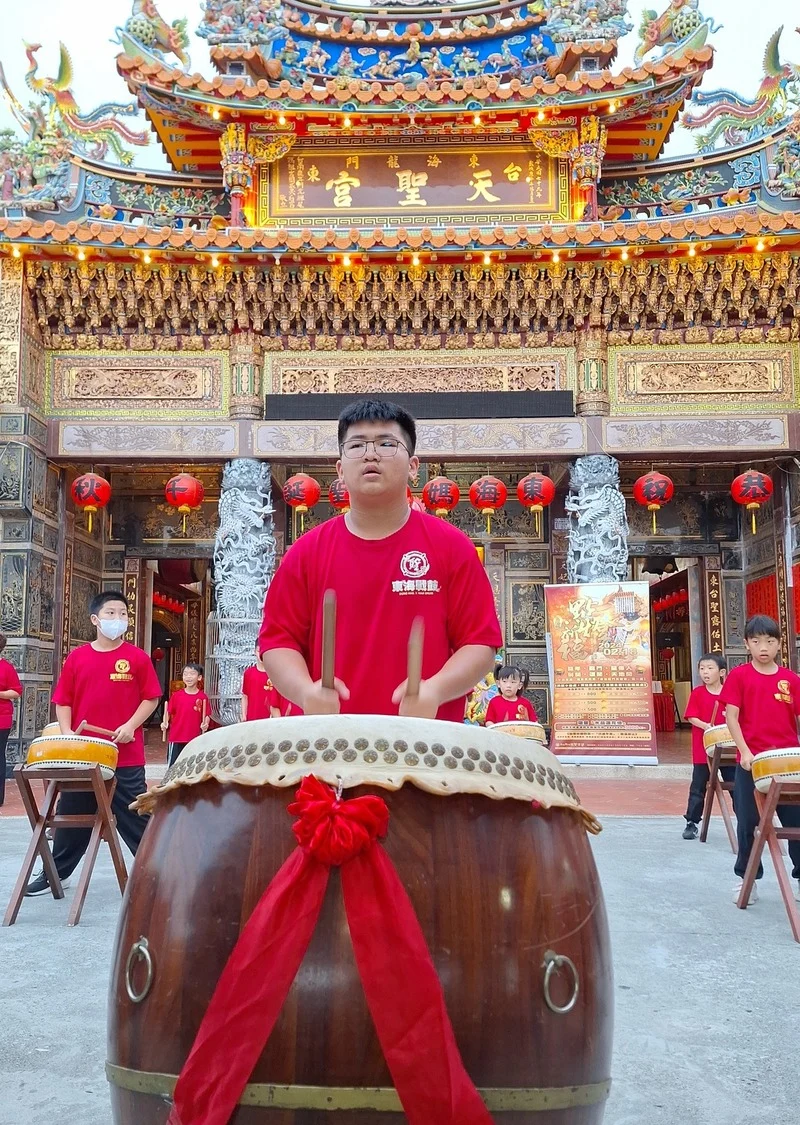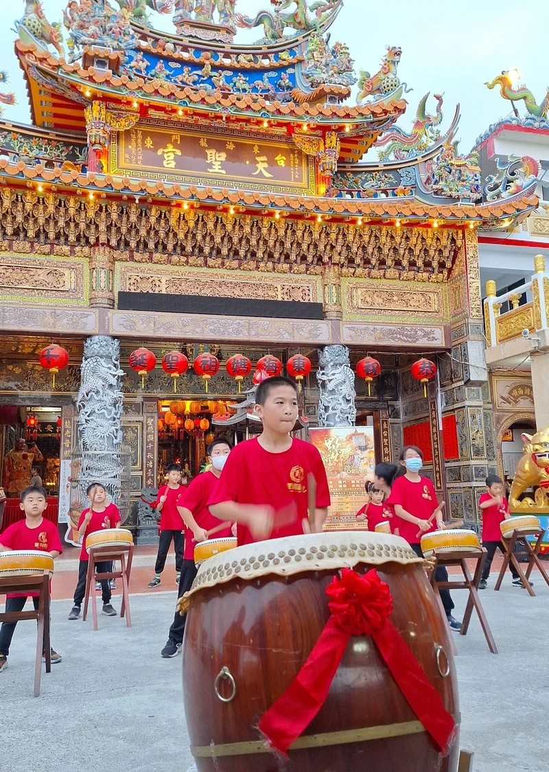 國內非常高知名度的『九天民俗技藝團』,原為傳統廟會陣頭團體,創團團長許振榮 早期專門收容中輟的孩子,訓練他們打鼓發洩精力,並擁有一技之長;但隨著時代更迭,為使傳統民俗文化得以轉型並永續傳承、並逐漸強化陣頭表演的藝術性、將陣頭搬上表演藝術的殿堂,目前九天已經常受邀到國內外表演,成為國內知名表演團體。許振榮團長賢伉儷在兒童節前一天到東海龍門天聖宮參拜交流,除了允諾➡️