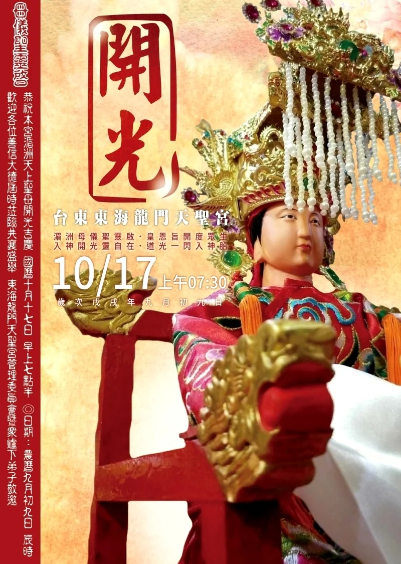 恭祝本宮湄洲天上聖母開光吉慶,擇於國曆十月十七日(農曆九月初九)辰時(上午七時三十分)舉行開光啟靈儀式,歡迎各位善信大德蒞臨共襄盛舉。