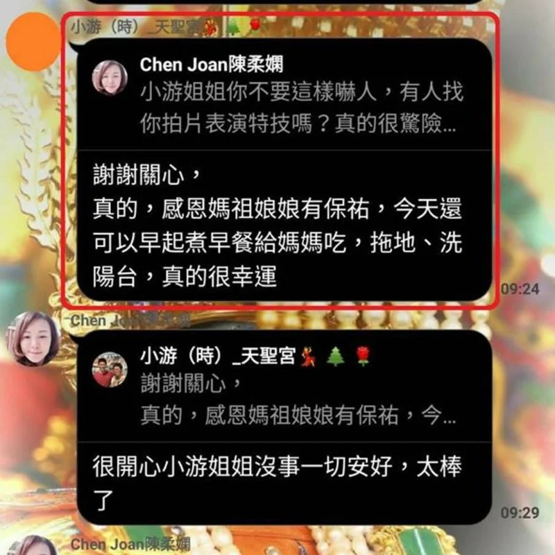 『感恩媽祖娘娘有保祐,今天還可以早起煮早餐給媽媽吃,拖地、洗陽台,真的很幸運』!