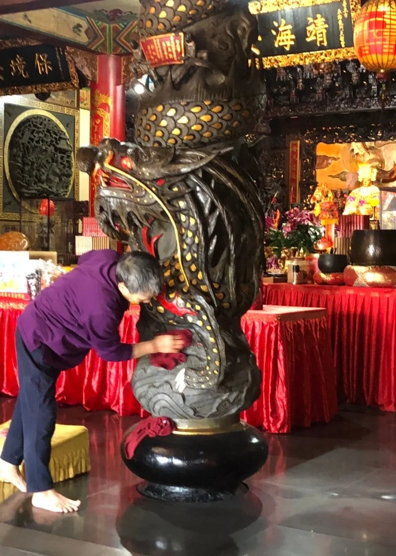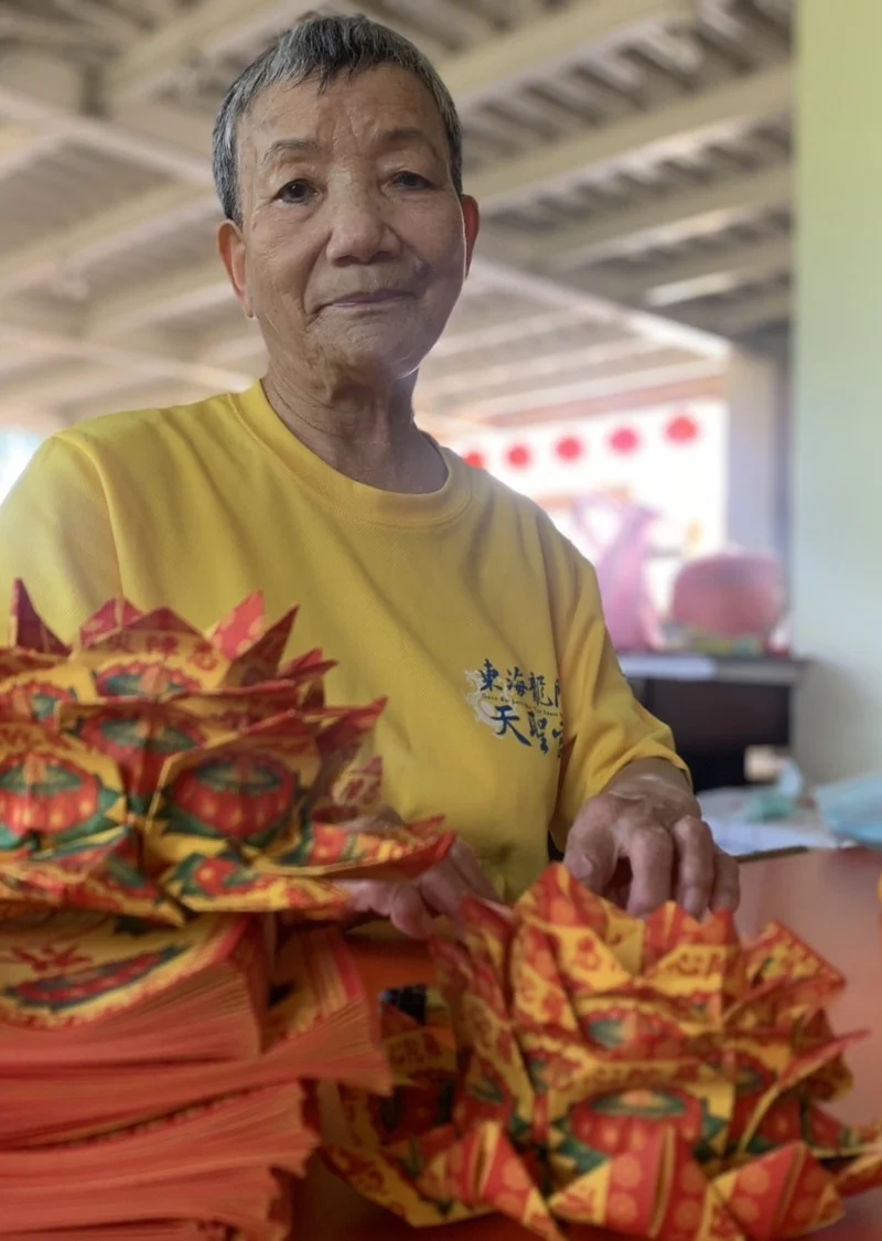 「或許這就是我跟東海媽的一世因緣!」張準專心摺著紙蓮花說,她從小就接觸佛教,20多年前就開始到東海媽這邊坐志工,幫忙清爐、打掃、摺紙蓮花,自己也會跟媽祖祈求「一家進出平安、子孫順利」,即使罹患乳癌,她仍祈求媽祖「保佑我身體可以快些好起來,才能繼續服侍媽祖!」
