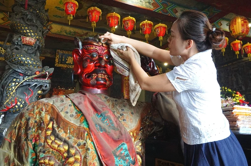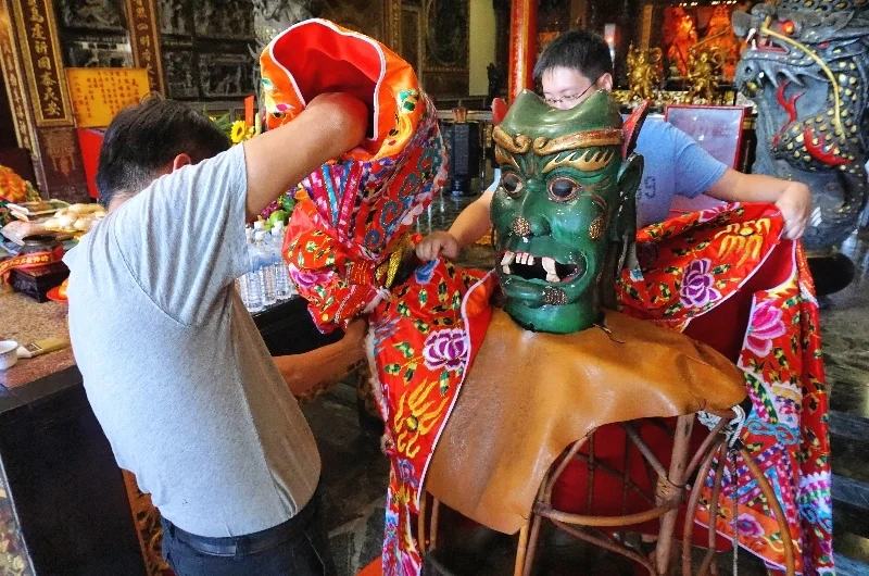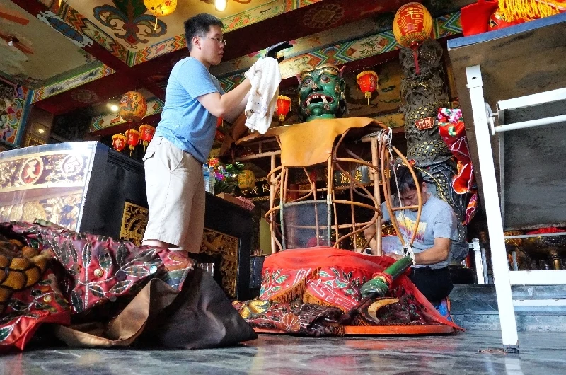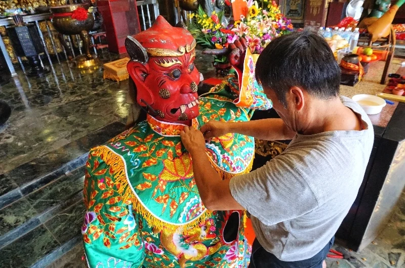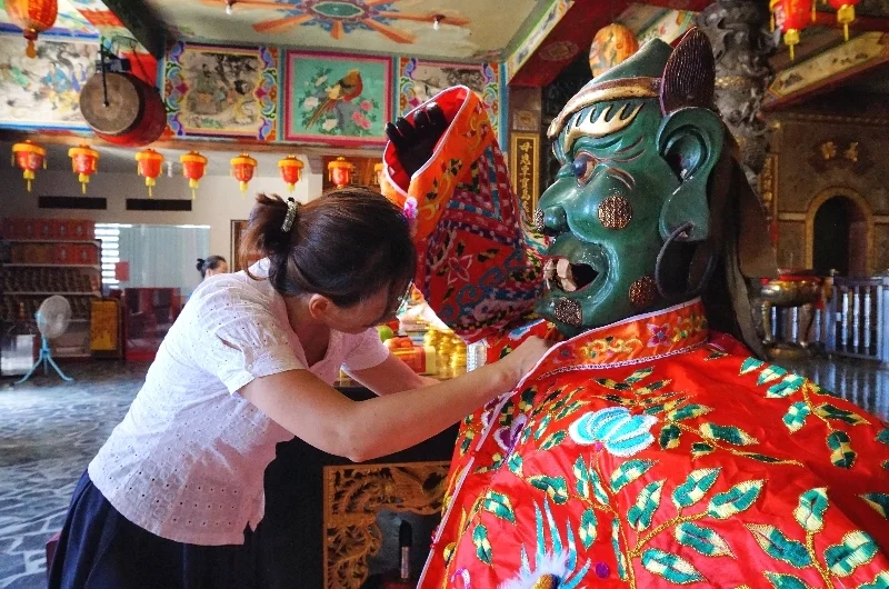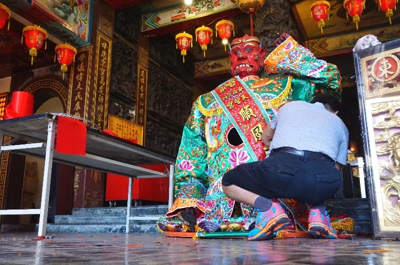本日上午將千里眼與順風耳的神將衣予以換新整理,三十年的時間老舊的衣服與剝落的布屑,看到了歲月重重的堆疊。那曾經在元宵節與廟會繞境活動時,炮堆裡來煙火裡去的千里眼順風耳,因為許久未參加遶境活動,漸漸被遺忘那一身英勇的戰袍也應該找時間予以重新整裝了。三十年的時間想來有愧,換裝時仍感受到滿滿慈愛的氛圍,新舊交替也代表著世代交替,一種不同的呈現,它正在慢慢地凝聚。