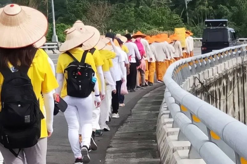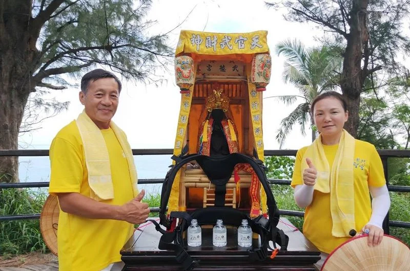 這群由北港武德宮林安樂主委 率領陪著武財公浩蕩闖天涯的師兄姐們,已經離家逾半個月,從南往東的路程,要捱得住烈日吹給他們的焚風;日前從大溪部落集結出發,延海岸線前往太麻里時,又遇上颱風外圍環流所帶來的風雨,大部隊集結團拜後是直接穿上雨衣,風雨更大時,一行人又在行進間換上了拖鞋。