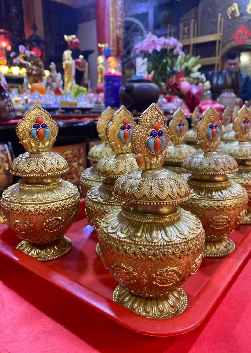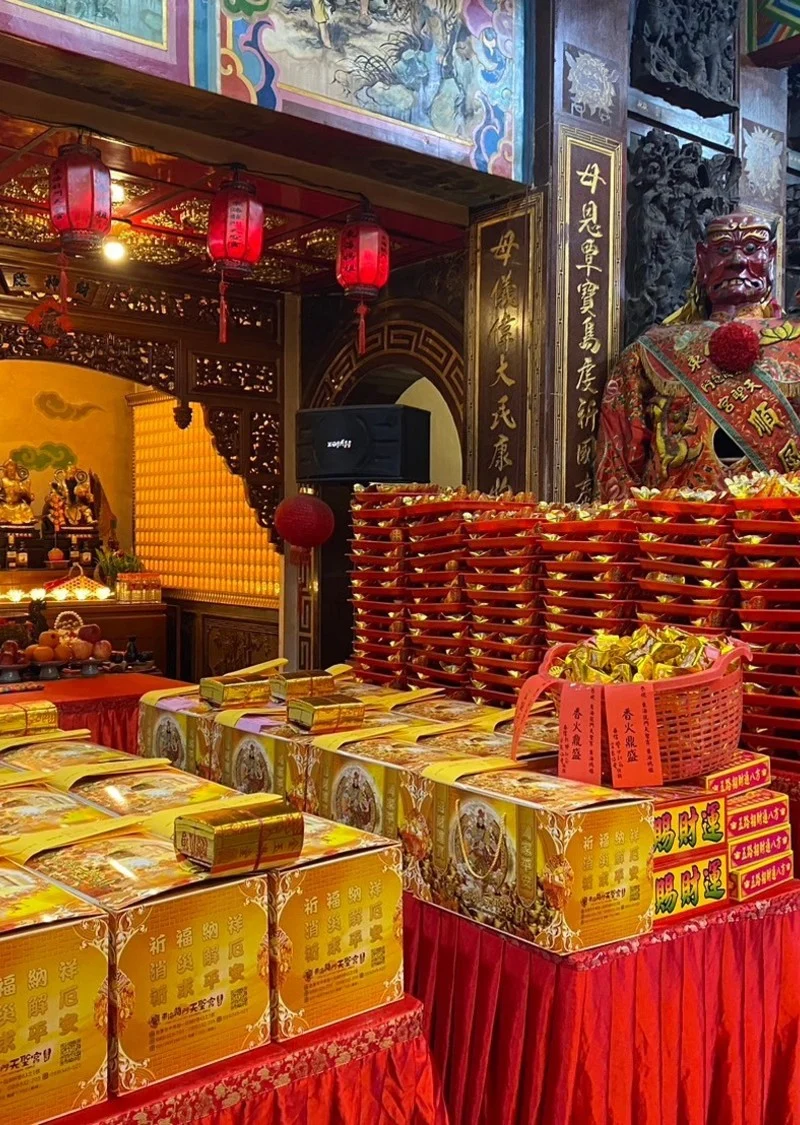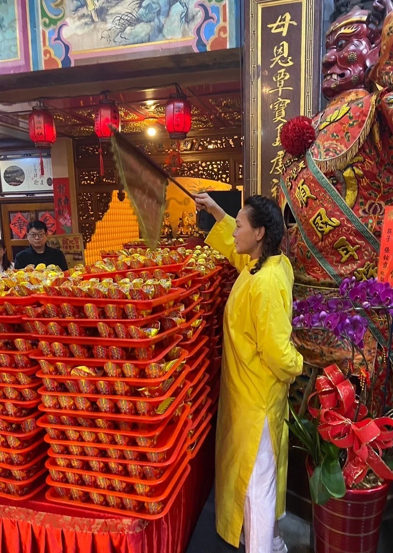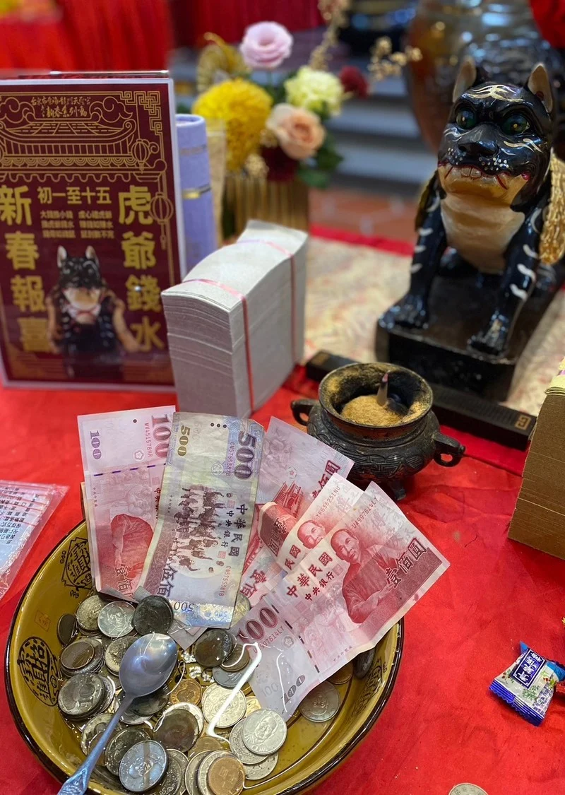 在補財庫儀式中,由信徒接龍傳遞元寶、財寶箱,彷彿一條「金龍」躍龍門!每接過一盤元寶大家會說出一句吉祥話,現場喜氣滿滿