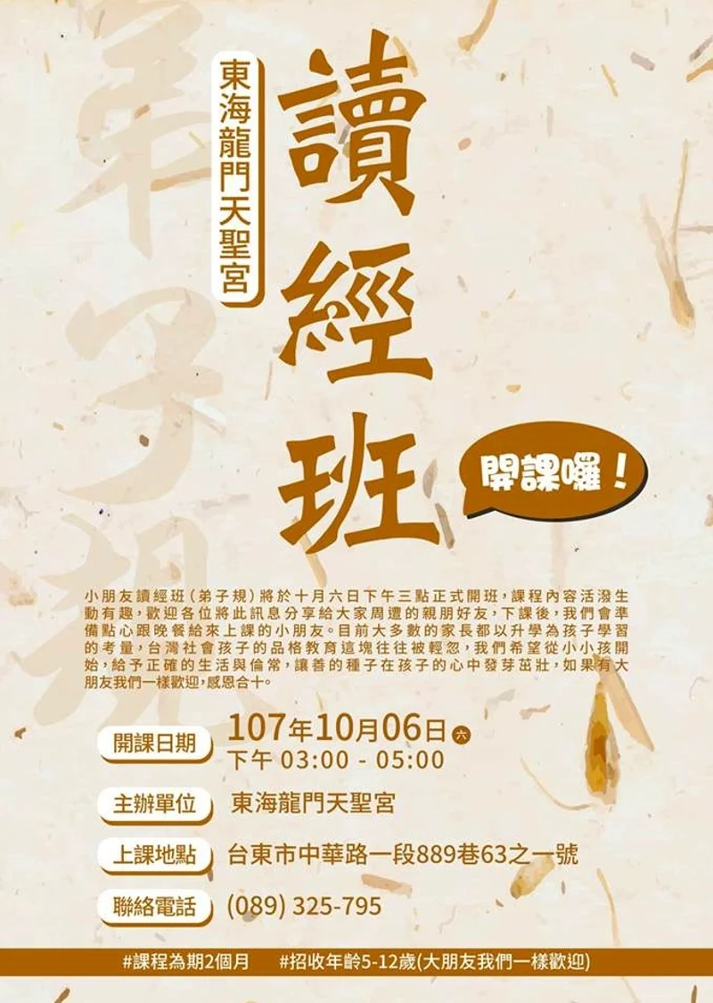 兒童讀經班弟子規生活教育課程十月六日開課 民國一O七年(戊戌)九月三十日週日 文字、製圖:東海龍門天聖宮資訊組