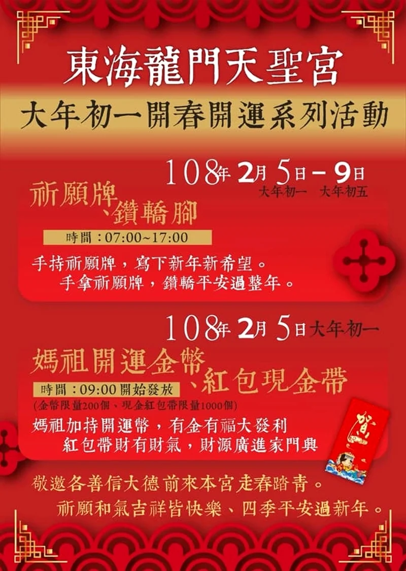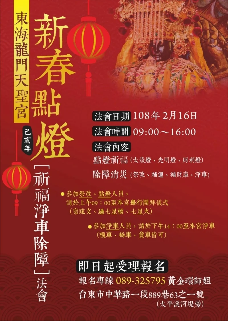 己亥年新春點燈.祈福淨車除障法會 民國一O八年(戊戌)元月二十八日週一 文字、製圖:東海龍門天聖宮資訊組 【新春活動通知.春節系列活動】